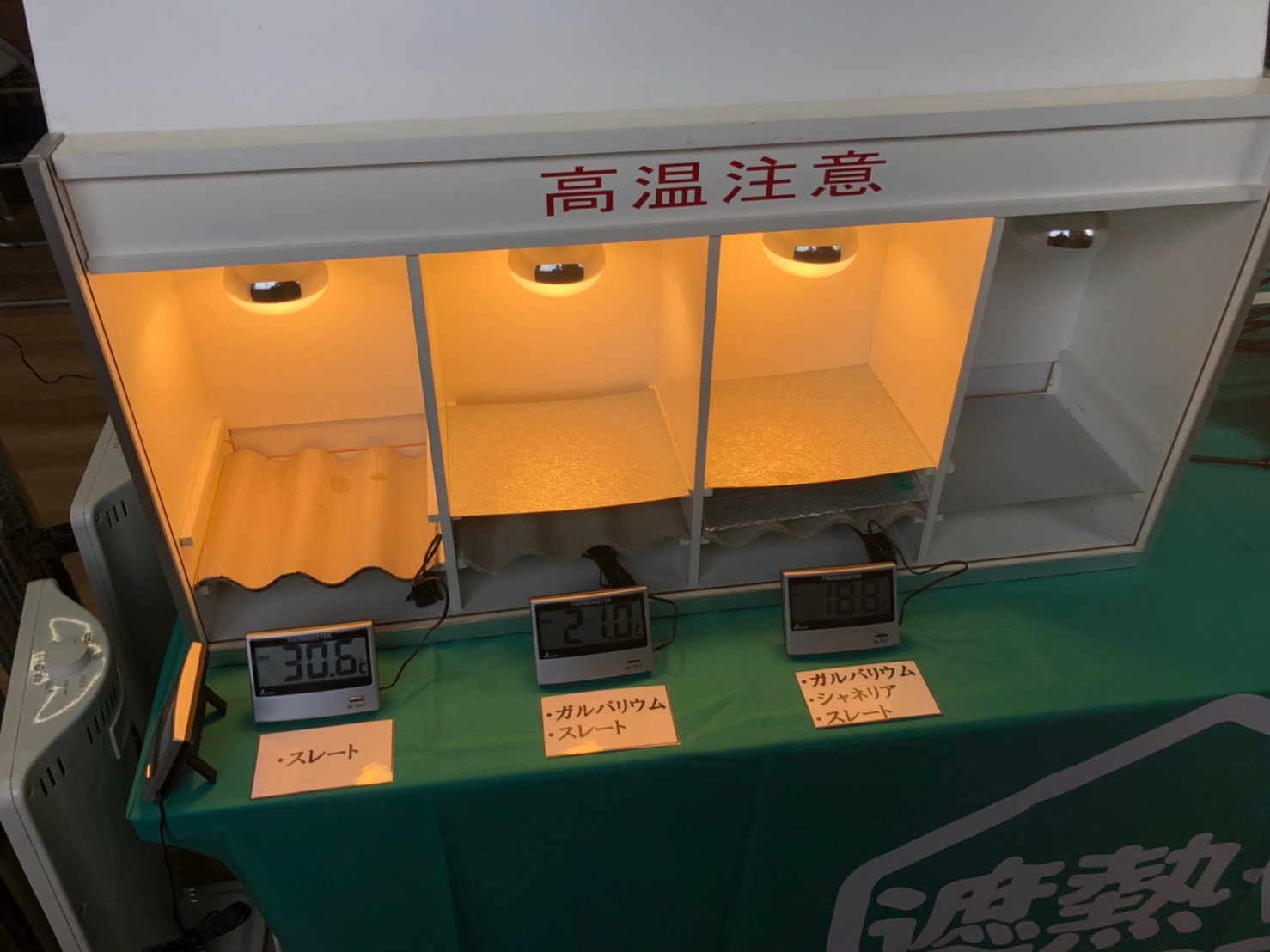 照射後30分の温度差をご覧いただき、遮熱の効果を見て頂けるデモンストレーションになっています。