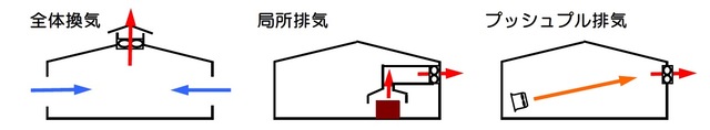 さらに、換気は全体換気、局所排気、プッシュプル排気の3種類あります。