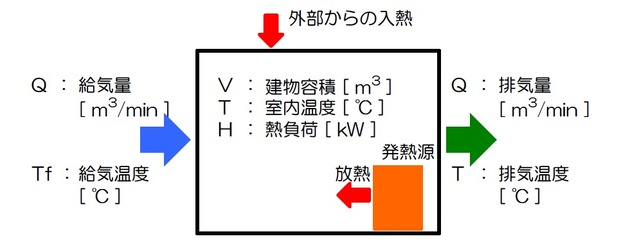 室内で発生する熱は太陽の熱や機械の熱など、出ていく熱は換気、エアコンの冷房で排出される熱などがあげられます。