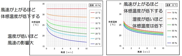 温度が低いほど風速の影響を大きく受け、体にあたる風量が大きくなると熱の移動量が増加し、より涼しさを感じられます。