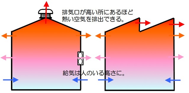 温度が高くなる室内の上部に排気口を設けると熱排出量を増やせ、換気の効果が高まります。