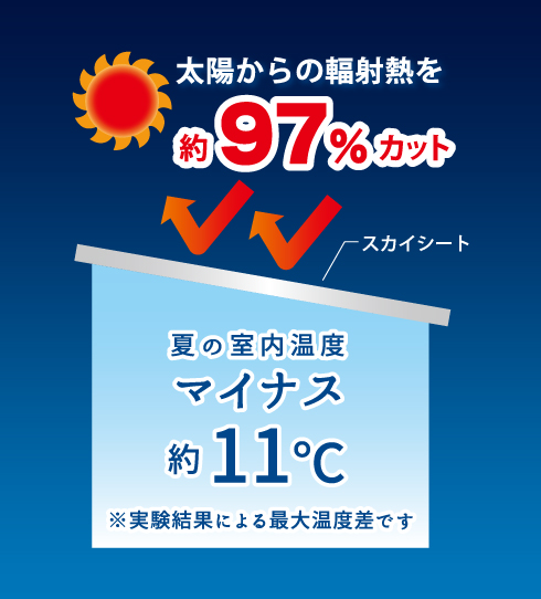 スカイ工法で用いるスカイシート(遮熱シート)は、反射率97%のアルミ箔により太陽からの輻射熱による折板屋根の温度上昇を大幅に抑えます。