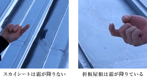 スカイ工法未施工の屋根には、夜間に屋根の温度が下がったため霜が積もっていますが、スカイ工法を施工した屋根には霜が積もっていません。