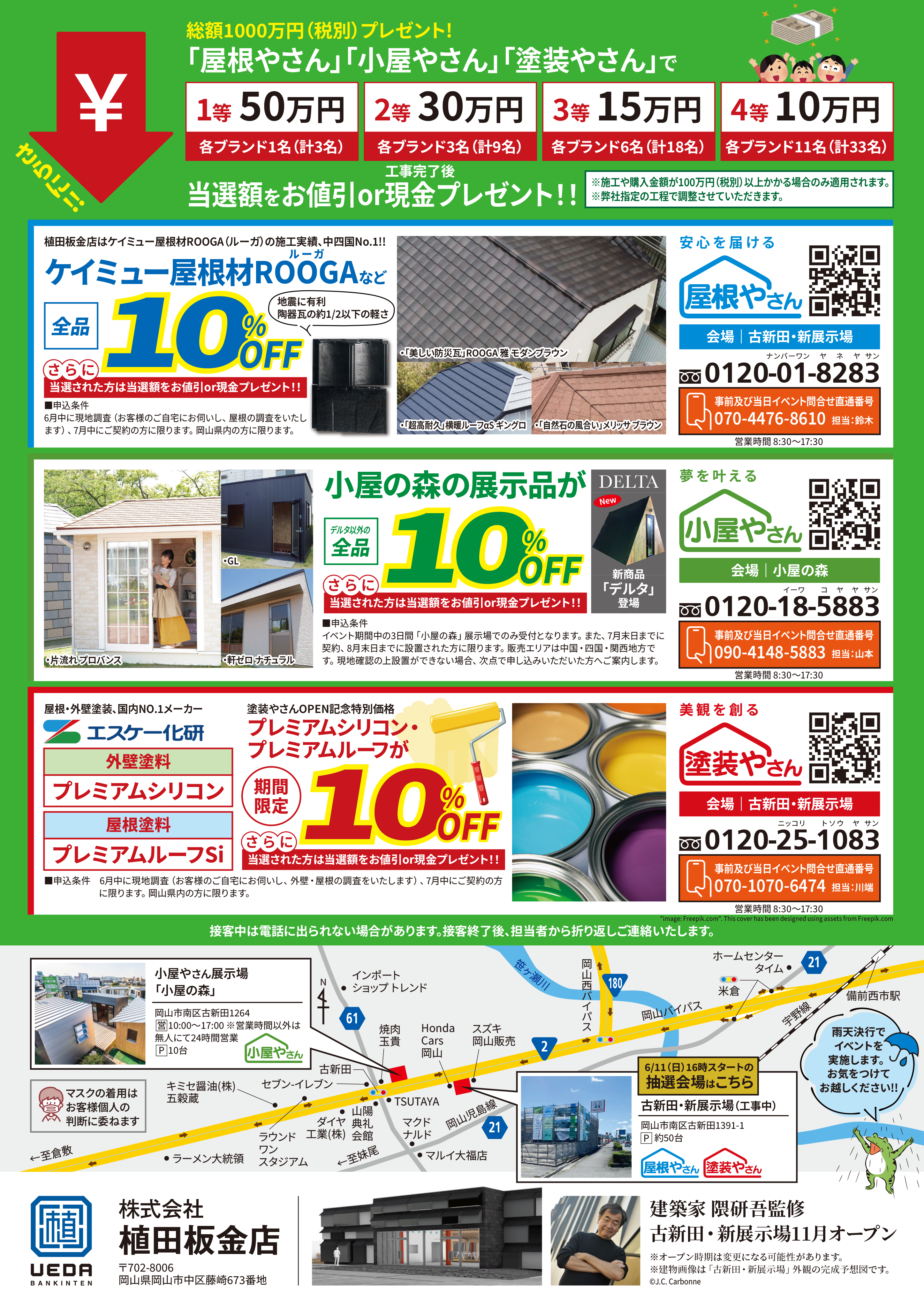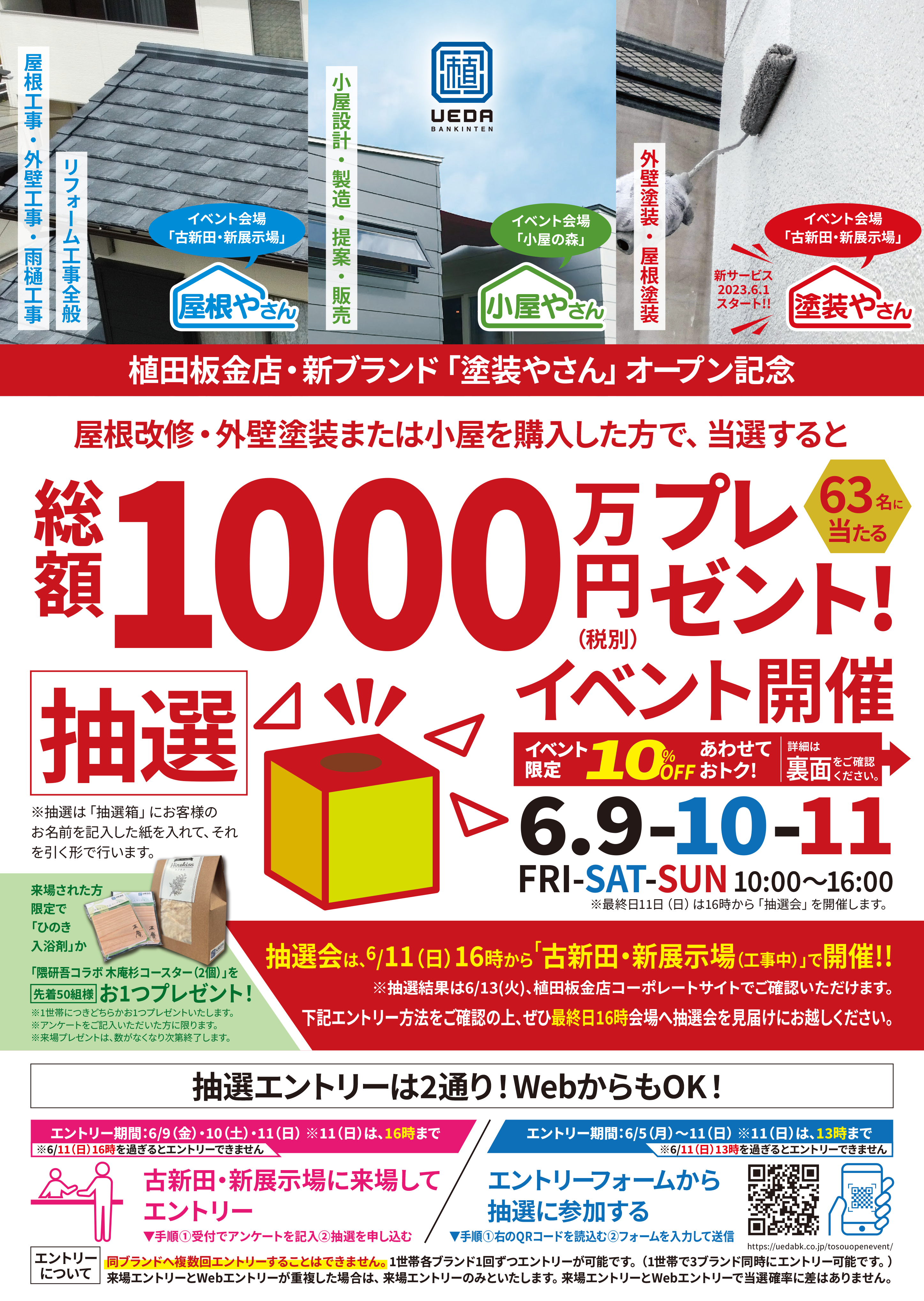 今回は、塗装やさんのOPENを記念して、植田板金店の創業以来、かつて経験のない大規模なイベントが開催されます。「屋根やさん」「小屋やさん」「塗装やさん」のブランドが一同に行うイベントで、「屋根改修・外壁塗装または小屋を購入した方で、当選すると総額1000万円(税別)プレゼント」です。総額1000万円(税別)プレゼントは、抽選となります!こちらは、Webからも抽選していますので、気になった方はぜひ抽選だけでもご参加いかがでしょうか。
