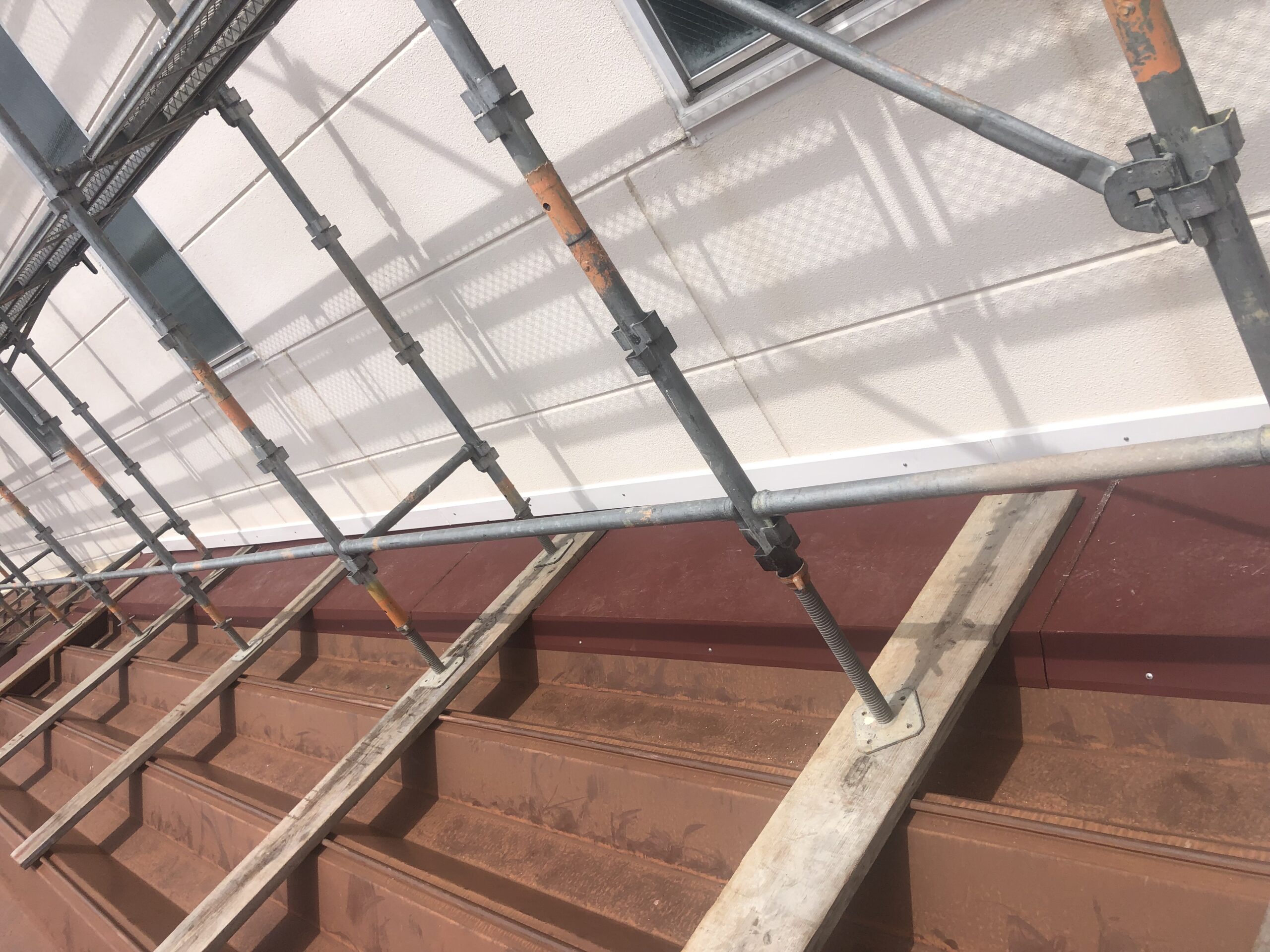 今回は遮熱効果を高めるため先に遮熱塗装工事を行い、上からルーフシェードを張って屋根の上に日陰を作りました。