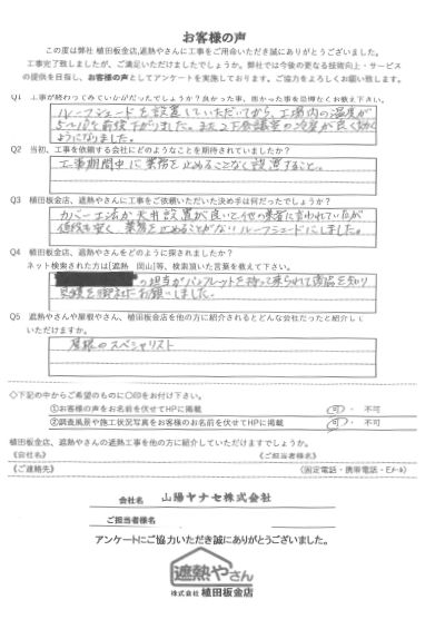 A. ルーフシェードを設置していただいてから、工場内の温度が5~10℃前後下がりました。また2F会議室の冷房が良く効くようになりました。