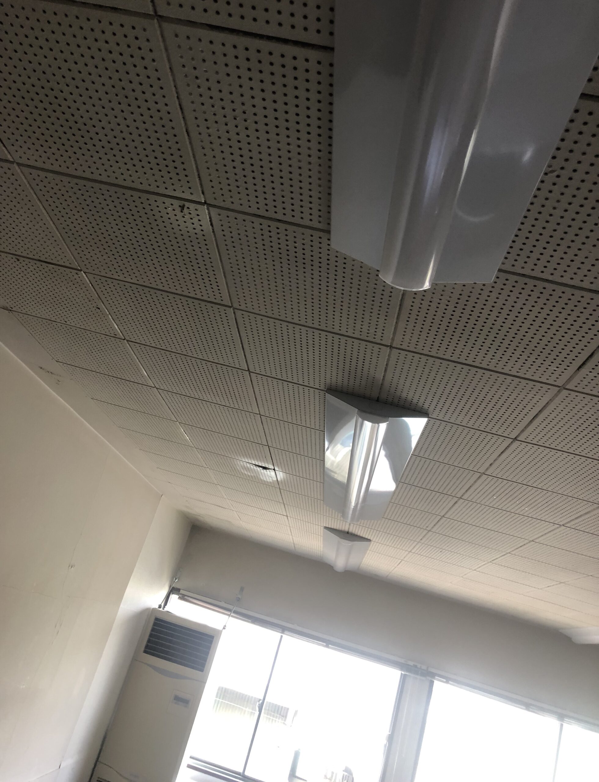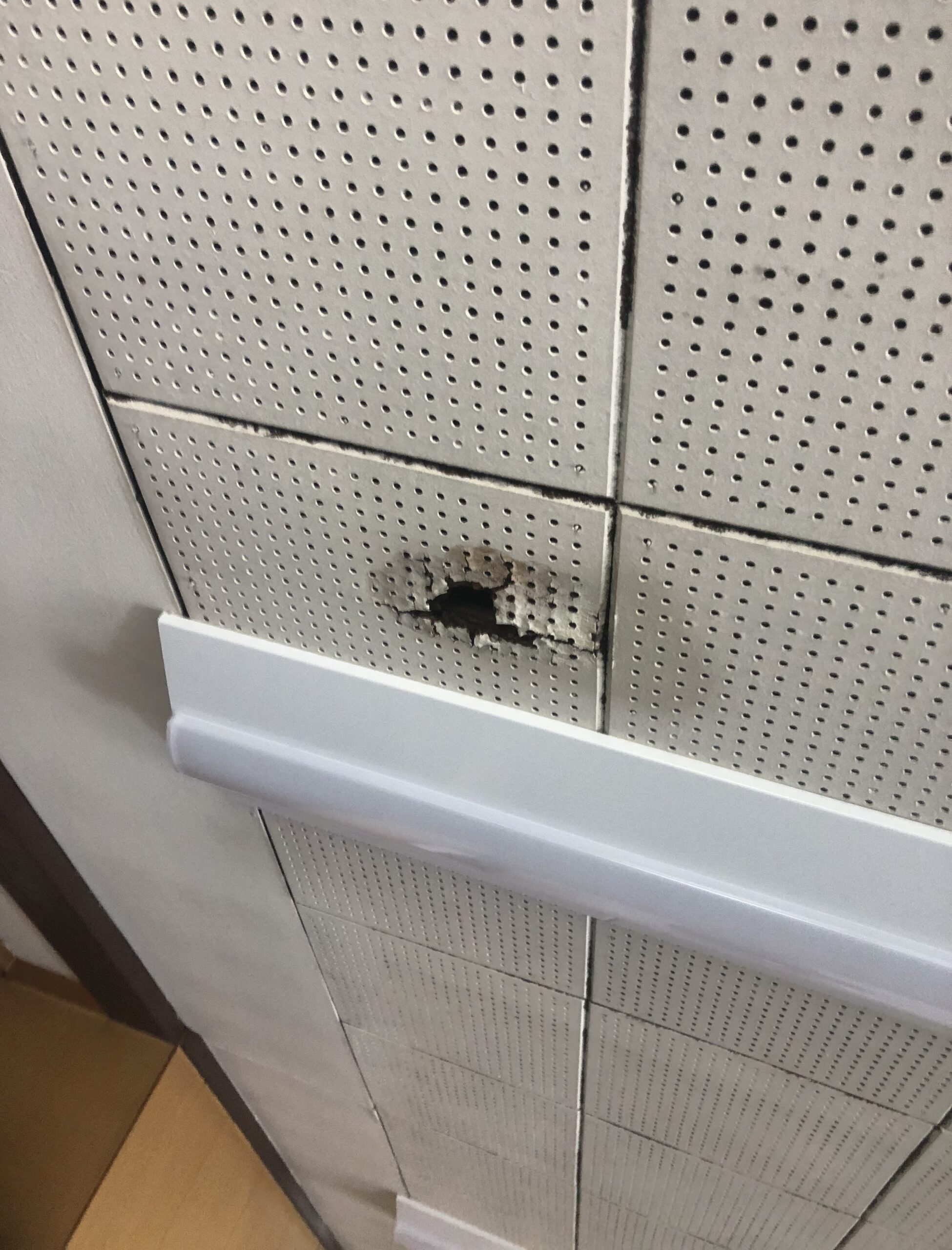 特に会議室の天井は被害が大きく、ひどい箇所は穴が開いていますし、日の明りに当てて見るといくつも雨のにじんだ跡が見えます。