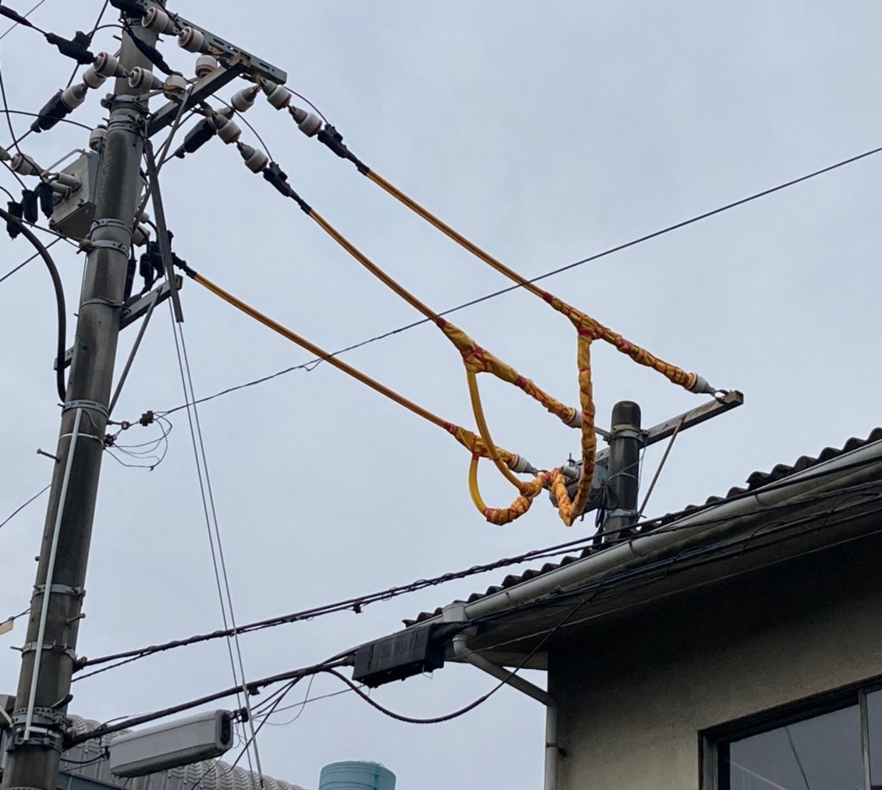 いよいよ工事ということですが、一つ気になったのが周囲の屋根に近い範囲内で、人が直接触れたり人が持っている金属が触れたら感電してしまいそうな電線が確認されました。